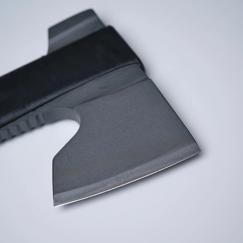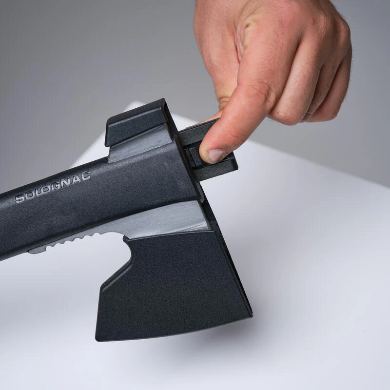 Un étui rigide en plastique est fourni avec la hâche pour protéger la lame et son fil tranchant, pour la transporter facilement à la ceinture.
