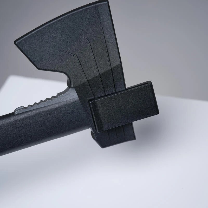 ATTENTION : il est normal de forcer le cran plastique pour insérer la hache au fond de son étui et entendre le clac sonore pour confirmer que la hache est sécurisée. Sinon elle peut ressortir de son logement.